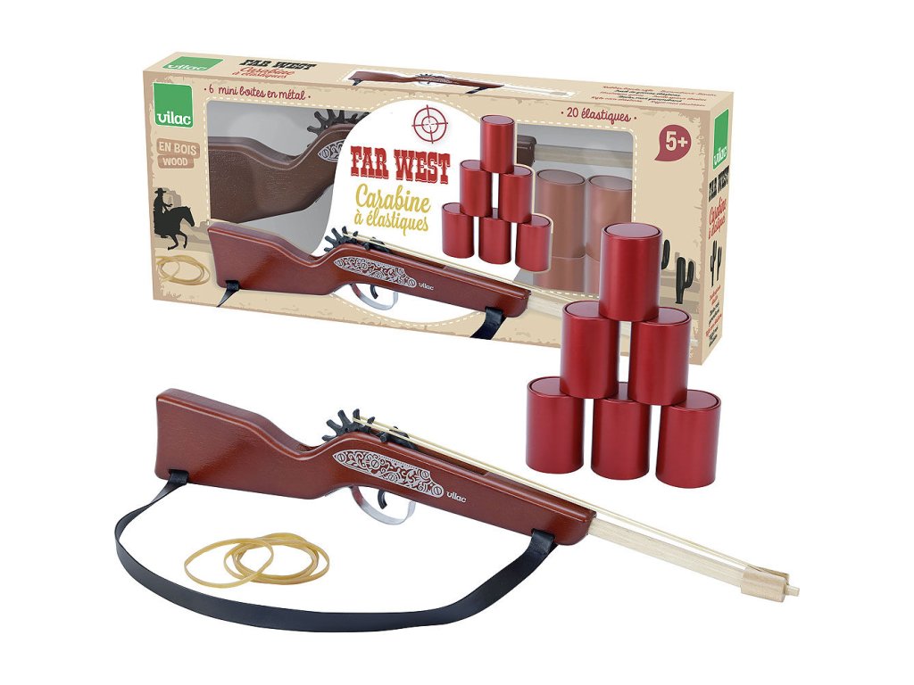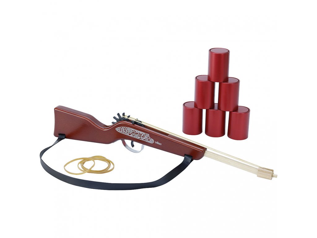 - Obsahuje dřevěnou pušku, 20 gumiček a 6 mini plechovek