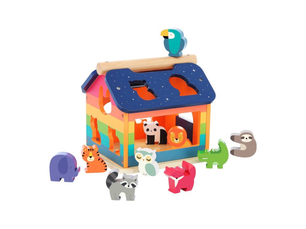 Tříděním a přemisťováním zvířátek se děti zábavně učí rozeznávat tvary, a lze je tak po krůčcích vést k samostatné hře v souladu s výukovými metodami Montessori. Rozmanité pestrobarevné figurky mohou správným pojmenováváním a přiřazováním charakteristických vlastností pomoci s rozvojem poznávacích dovedností a fantazie. Domeček je vybaven otevíratelnými dvířky, které jsou pružně zavěšeny tak, aby dětským prstíkům nehrozilo skřípnutí. Praktické madlo na střeše umožňuje snadnou manipulaci a přenášení. Hračka kombinuje robustní díly z masivního dřeva a odolné překližky, které zaručují vysokou životnost.